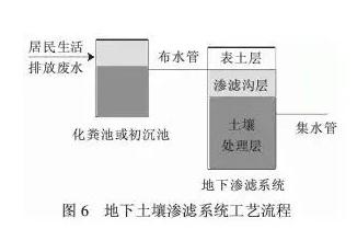 13、地下土壤渗滤系统:该系统将污水投配到土壤表面具有一定构造的渗滤沟中,污染物通过物理、化学、微生物的降解和植物的吸收利用得到处理和净化。工艺流程见图6。