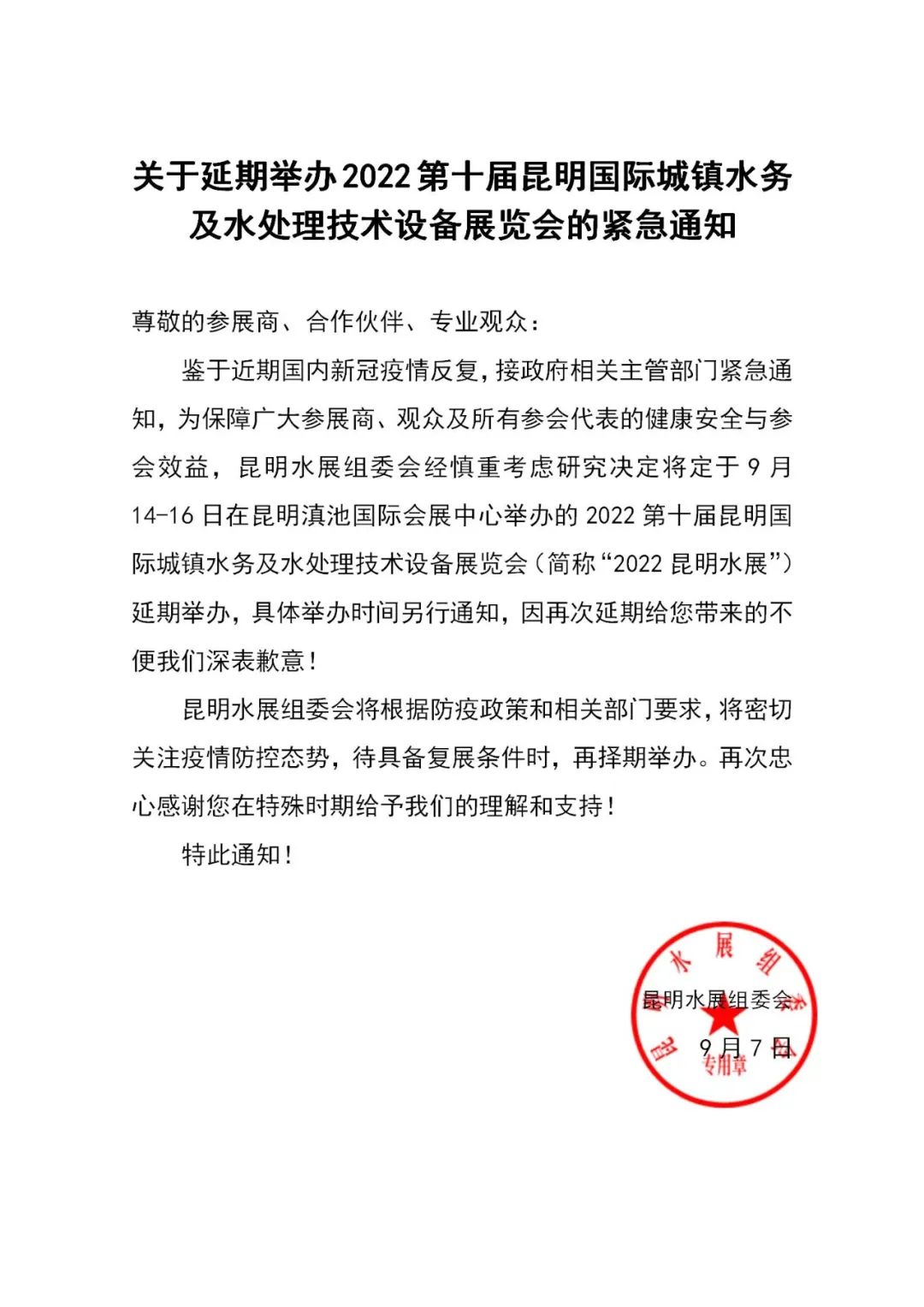 2022昆明水展延期通知